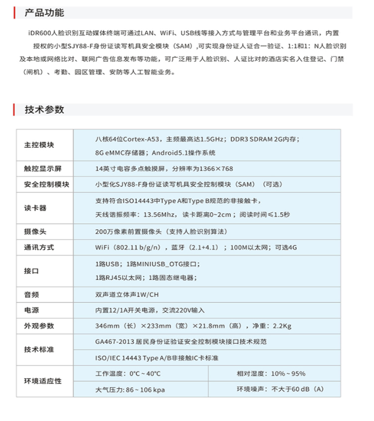 (*由于產品升級或其他原因,精倫IDR600人臉識別一體機產品實際參數有可能變更,以實際產品為準。本文中的所有陳述、信息和建議也不構成任何明示或暗示的擔保)